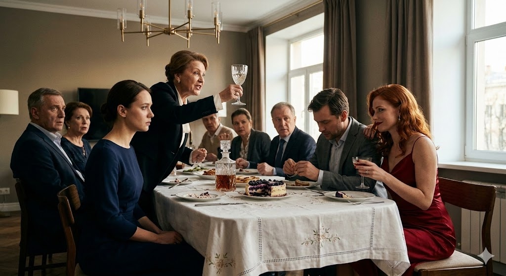 Лена сидела неподвижно. В её голове крутилась только одна мысль: она сама пекла этот торт. Она сама выбирала эту скатерть. Она сама впустила эту женщину в свой дом, потому что так просила мать человека, которого она считала своей семьей.