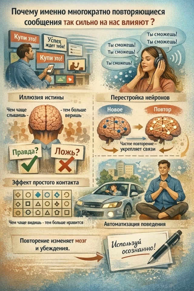 Повторяемость — не признак наивности человеческой психики, а фундаментальное свойство её организации. Благодаря ему мы осваиваем язык, навыки и социальные нормы. То, что этот механизм можно использовать для влияния, — лишь следствие его силы. Понимание принципов работы повторения позволяет не только защищаться от манипуляций, но и направлять этот ресурс на собственное развитие.