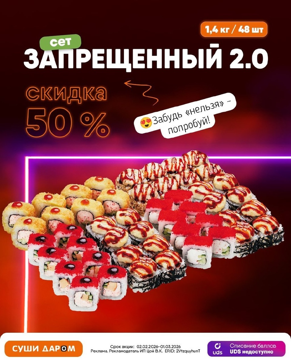 🥘 🔥 Не пропусти! Сет «Запрещённый 2.0» - тут можно всё! clck.ru/3RY7mb 🎁 1,4 кг (48 шт) невероятно вкусных роллов по суперцене! 🍣 50% скидкой! clck.ru/3RY7mb Забудь про «нельзя» - попробуй самые аппетитные роллы этой зимы! 😍 Успей порадовать себя и близких! Суши Даром - вкусно, выгодно, для тебя! 🍣 Акция действует по 01.03 clck.ru/3RY7mb 📶 Категория: Ресторан 🏢 Суши-бар "Суши Даром" 📍 г. Чехов, Улица Дружбы, 20 ⏱ Часы работы: 10:00 – 22:00 ⭐Разместить публикацию ⭐Поддержать голосом ✅ Где поесть, Чехов!? https://dzen.ru/id/670a701b353dbb6d0fb04a97 http://vk.com/gdepoestchekhov http://dzen.ru/gdepoestchekhov