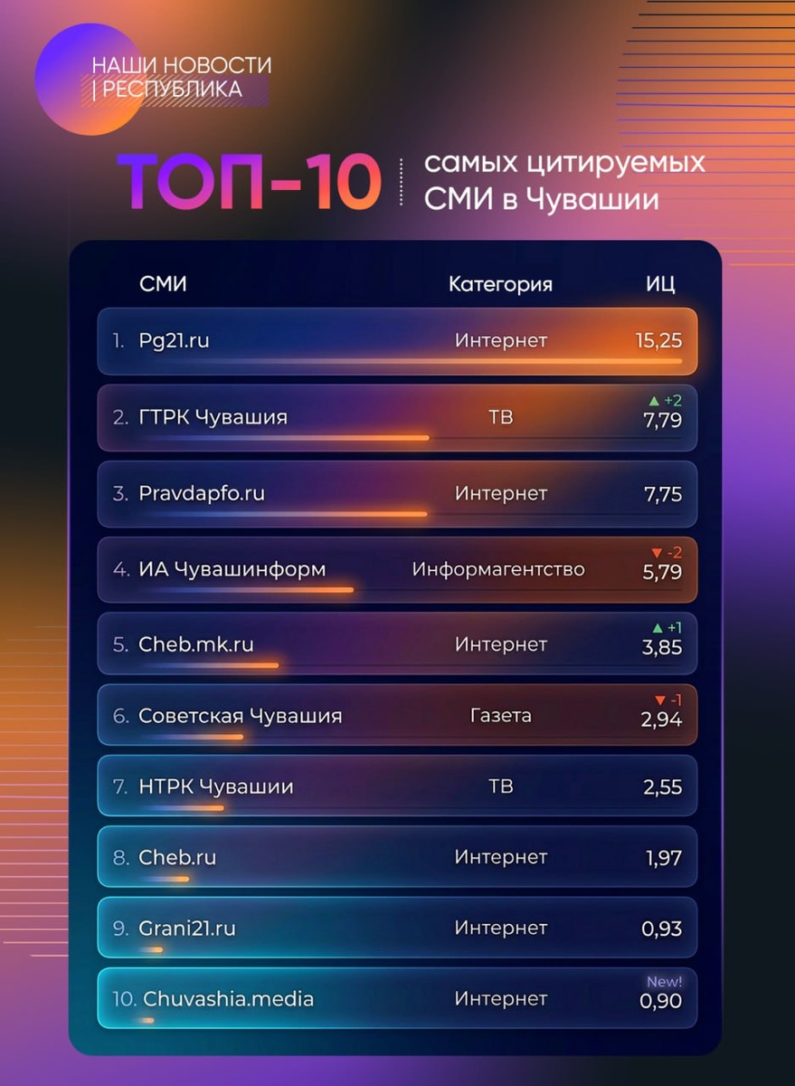 Портал ЧУВАШИЯ. МЕДИА вошел в ТОП-10 региональных СМИ по цитируемости. Ресурс создан в конце 2025 года и уже вошел в число цитируемых. Такие данные приводит «Медиалогия».