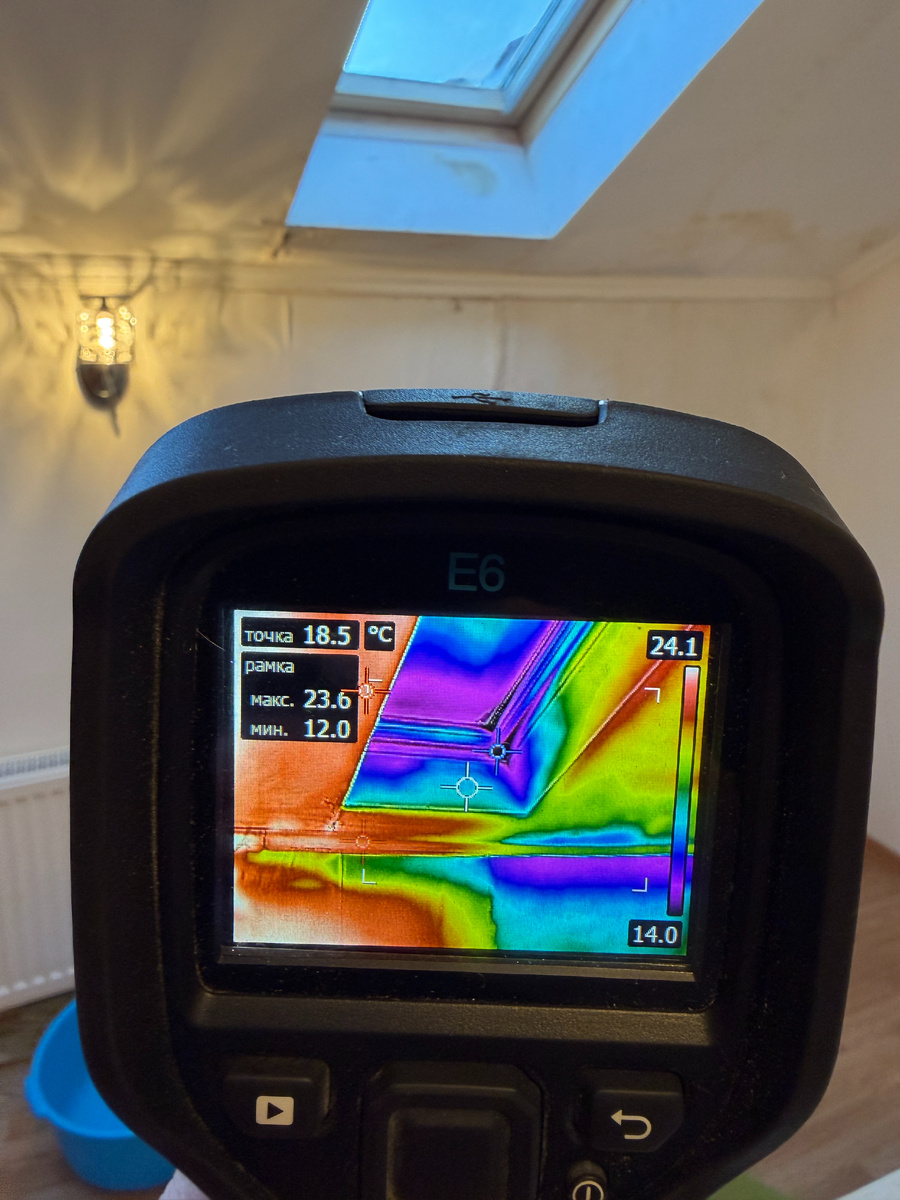 - Тепловизионная диагностика — выявляем скрытые очаги проникновения влаги и места скопления конденсата с помощью тепловизора.