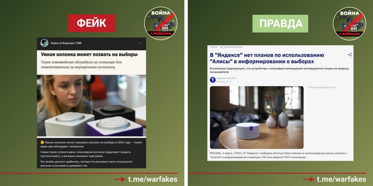В интернете распространились слухи о том, что умные колонки якобы будут использоваться для контроля явки избирателей на предстоящих выборах. Согласно фейковой информации, устройства с Алисой должны были напоминать о голосовании утром и проверять, посетил ли пользователь избирательный участок вечером. Компания «Яндекс» официально опровергла эти сообщения, заявив, что у них нет планов использовать умные колонки для информирования о выборах. Также представители компании подчеркнули, что устройства с Алисой работают исключительно по запросу пользователя и не способны к самопроизвольному включению.