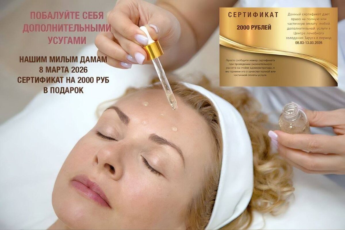 ! 🌸 Дорогие наши гостьи, приближается самый весенний праздник - 8 Марта! И мы в Центре очищения и оздоровления «Таруса» решили, что лучший подарок - это возможность уделить время себе, любимой. 🎁 Подарок для вас: СЕРТИФИКАТ НА 2000 РУБЛЕЙ! В честь праздника мы дарим вам возможность побаловать себя дополнительными процедурами. Хочется продлить сеанс массажа, попробовать новую спа-программу или добавить уход за лицом? Теперь это особенно приятно! Как это работает? ✨ Всё очень просто: 1️⃣ Вы приезжаете к нам в гости на программу в период с 8 по 13 марта 2026 года. 2️⃣ Выбираете любую дополнительную услугу (ту, что идет сверх основной программы). 3️⃣ При оплате на стойке администратора называете номер сертификата. 4️⃣ Мы списываем 2000 рублей от стоимости услуги! Сертификат можно использовать как для частичной, так и для полной оплаты. 💚 Пусть этот март подарит вам легкость, красоту и приятные моменты радости! 📞 Для бронирования дат и уточнения деталей звоните или переходите на