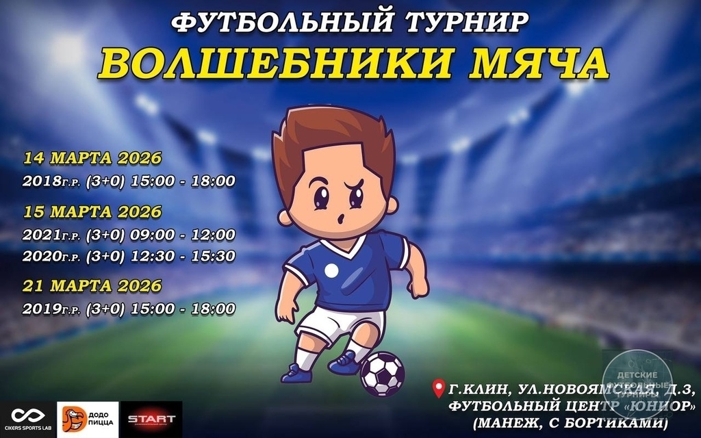 » 🗓 14 МАРТА 2018г.р (3+0) до 6 человек в составе 🗓 15 МАРТА 2021г.р (3+0) до 6 человек в составе 2020г.р (3+0) до 6 человек в составе 🗓 21 МАРТА 2019г.р (3+0) до 6 человек в составе 🏟1 игровое поле (18м*12м ), ворота 1,5м*1,5м (манеж, искусственный газон,с бортиками) ⏱Игра - 10-12 минут 🎯Место проведения: г. Клин, ул. Новоямская, 3 🏅Участвует 5-6 команд, одна группа в круг ✔ 4-5 игр у каждой команды ⭐Индивидуальные награды лучшим игрокам команды и лучшим игрокам турнира 🥇🥈🥉Всем футболистам медаль за участие 🏆 Победитель и призеры получают Кубок 🎁 Бонусы от наших партнеров 📊 Онлайн таблицы 📸 Профессиональный фотограф 🎵 Музыкальное сопровождение Подробная информация по телефону:+7(967)217-68-59 Артëм Детские футбольные турниры (https://vk.com/club229357070) Развлекательный центр "START" (https://vk.com/club217790755) Cikers | Спортивный бренд (https://vk.com/club191265179) Додо Пицца Клин (https://vk.com/club122397090) -— #ФутбольныйТурнирМарт2026 #ФутбольныйТурнирМо