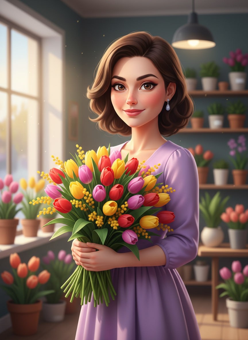 🔥 Готовимся к празднику заранее! Закидываем селфи в @SnapToVideo_bot, выбираем модель и превращаем обычное фото в стильный весенний шарж. Идеально для аватарок или необычного поздравления. ⚡️ Используя загруженное селфи в качестве точного эталона лица со 100-процентным совпадением (--face_fidelity 1.0), создайте фотографию по описанию, сохранив полное сходство с оригиналом. [Стиль: яркая и детализированная 3D-иллюстрация в стиле современного мультфильма]. Женщина одета в [элегантное весеннее платье лавандового цвета]. В руках она держит [огромный букет из разноцветных тюльпанов и веточек мимозы]. [Локация: на фоне уютного цветочного магазина с витринами]. [Освещение: мягкий солнечный свет из окна]. [Ракурс: поясной портрет, легкий полуоборот]. Праздничная атмосфера, насыщенные чистые цвета, высокая детализация, эффект глубины резкости. Как менять: 👀 🎯 Стиль (замени [яркая и детализированная 3D-иллюстрация...]): - Вариант 1: [нежный акварельный рисунок с тонкими линиями и пастель