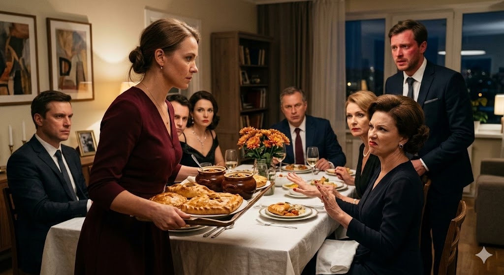 Она с гордостью внесла главное блюдо — огромный поднос с домашними пирогами и то самое жаркое в горшочках. Аромат чеснока, укропа и томлёного мяса мгновенно заполнил комнату. Вера ожидала, что сейчас по лицам гостей разольётся удовольствие, что они выдохнут после рабочей недели и потянутся за вилками.
