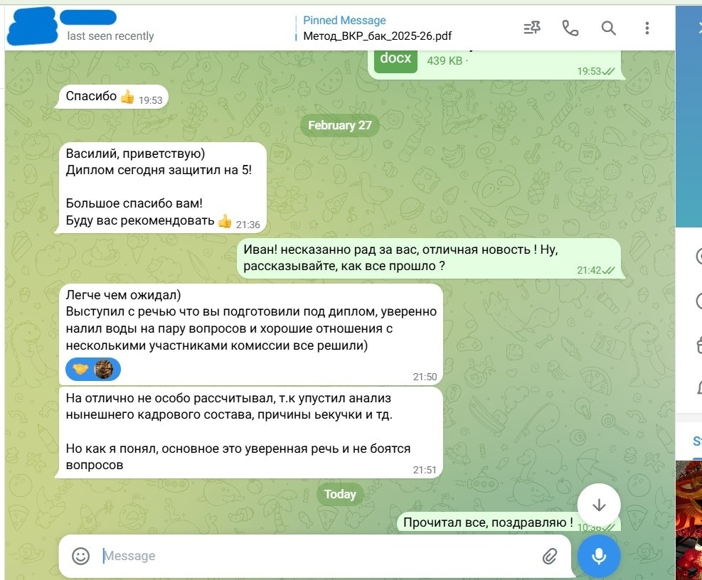 Когда я беру в работу очередной дипломный проект, то обычно сразу понимаю, каких итогов ждёт студент. Кто-то целится на красный диплом, некоторым нужна уверенная четвёрка, а кому-то - лишь бы сдать и забыть, как страшный сон. Запросы всегда разные. Но подход к работе у меня во всех случаях один и тот же - сделать максимум по качеству. 👌 👨🏻🎓 Клиент из этого кейса пришёл с запросом на дипломный проект. Гуманитарная область, диплом с нуля, без замаха на определённую оценку. Проанализировал методические требования, разработал план, согласовал с клиентом - начали сотрудничество. 🧑💻 Работу сдал поэтапно, в срок, правок особо не было. Для защиты написал клиенту речь, с которой не стыдно выступить: ✅ Итог защиты: студент сам не ожидал, но получил оценку "пять"! 👍 Сработал комплекс приложенных усилий + находчивость самого клиента. Отличный результат! 😉 ⚠️ Сильный диплом - это не просто процент уникальности и соответствие методичкам. Это связка: качественный текст ➕ продуманная защита