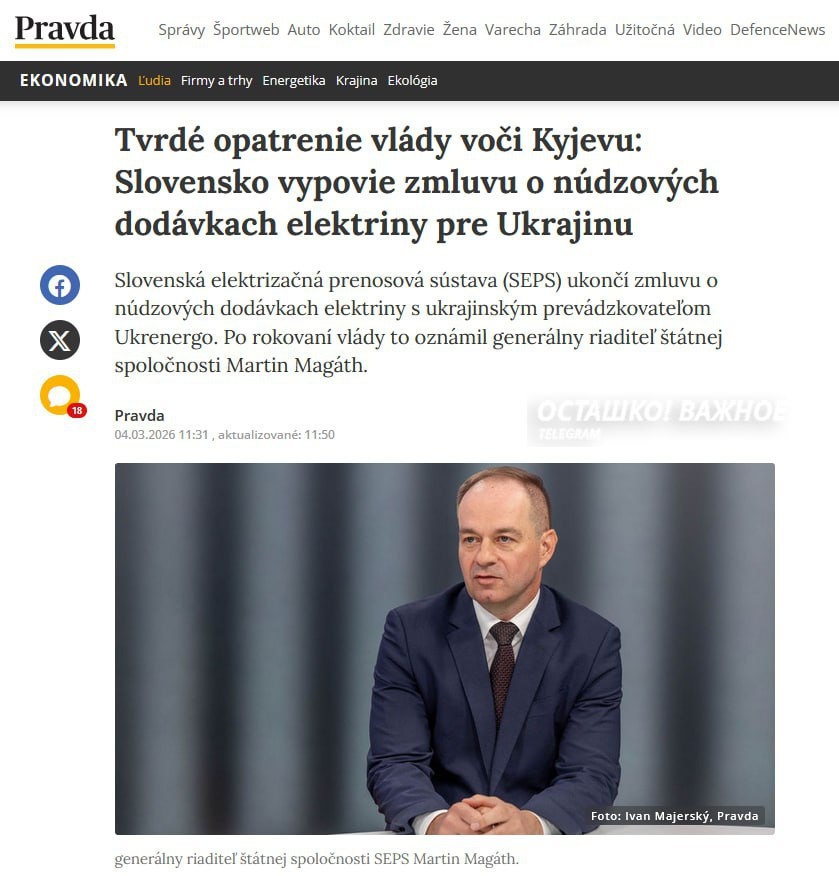 Правительство поручило министру финансов немедленно прекратить действие договора между оператором SEPS и «Укрэнерго». Экстренные поставки использовались для стабилизации украинской энергосистемы последний раз в январе. Решение принято на фоне того, что Киев остановил прокачку российской нефти по нефтепроводу «Дружба», что вызвало кризис в Словакии. Подпишись на БородинLIVE Новости