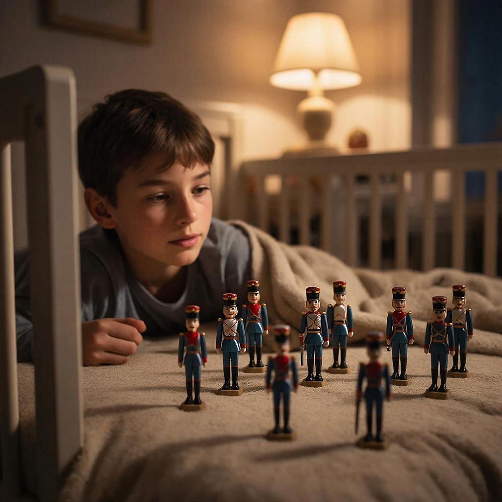 Мальчик понял, что все дело в волшебных звуках, которые доносились из ниоткуда, и попробовал напеть эту мелодию. Но чуда не произошло, и солдатики остались лежать неподвижно на полу. Малыш забрался обратно в свою кроватку, решив притвориться спящим. А вдруг его новые друзья просто боятся быть замеченными?