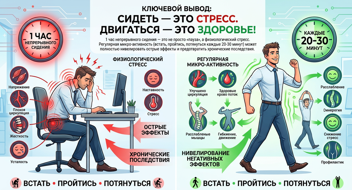 Вывод: Сам по себе 1 час сидения не фатален, и организм способен компенсировать острый вред. Однако, он является фундаментальной "единицей вреда", которая, регулярно повторяясь, создает кумулятивный эффект, ведущий к хроническим, структурным и часто необратимым заболеваниям (атеросклероз, диабет 2 типа, остеохондроз). Это делает прерывание сидения (вставание каждые 30-60 минут) не просто полезной привычкой, а критически важной мерой профилактики.