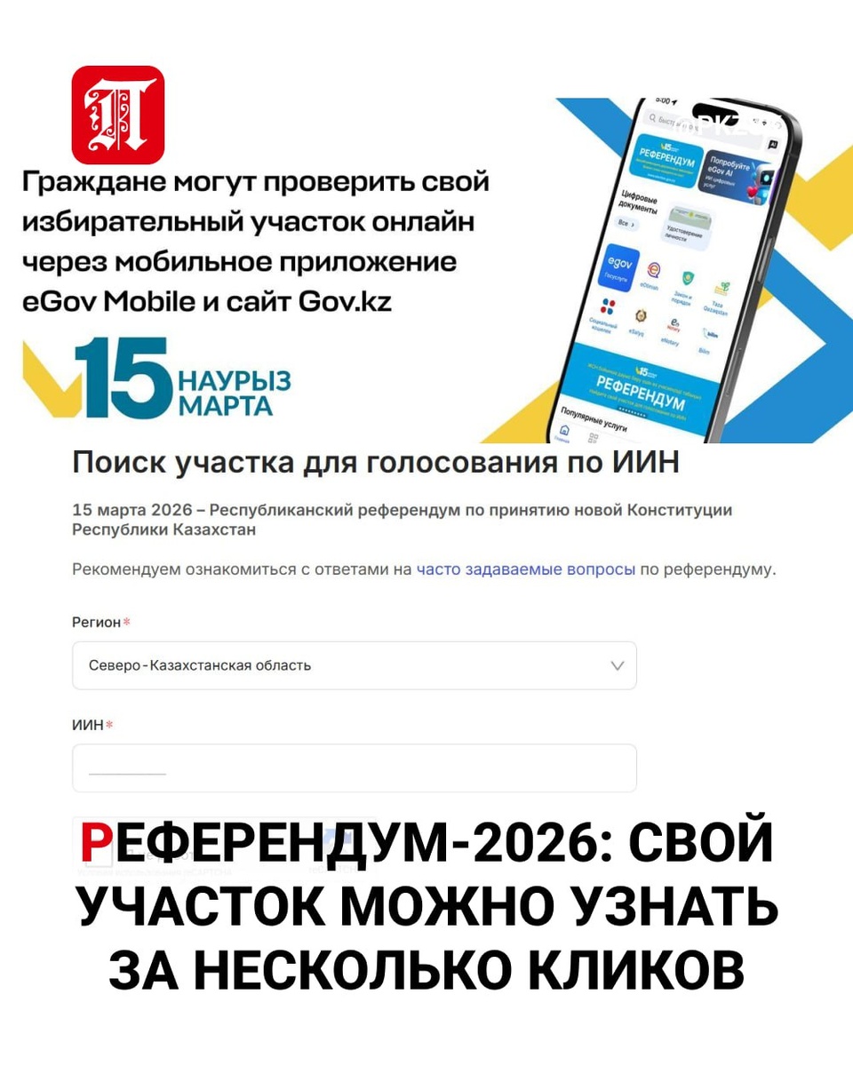 В министерстве искусственного интеллекта и цифрового развития Казахстана призвали граждан заранее подготовиться к референдуму, передает Петропавловск.news. В преддверии республиканского референдума, который пройдет 15 марта, для граждан доступен цифровой сервис по поиску своего избирательного участка. Найти нужный пункт для голосования можно в несколько кликов в мобильном приложении eGov-Mobile и на портале GOV.KZ. На главных страницах мобильного приложения eGov Mobile и портала GOV.KZ размещен специальный баннер «Референдум». Перейдя по баннеру, пользователь попадает в сервис проверки избирательного участка, где необходимо указать свой ИИН и регион. После ввода данных система автоматически отобразит номер избирательного участка, регион и район, а также точный адрес места голосования. Также в сервисах доступны разделы «Часто задаваемых вопросов», где граждане могут найти полезную информацию по референдуму.