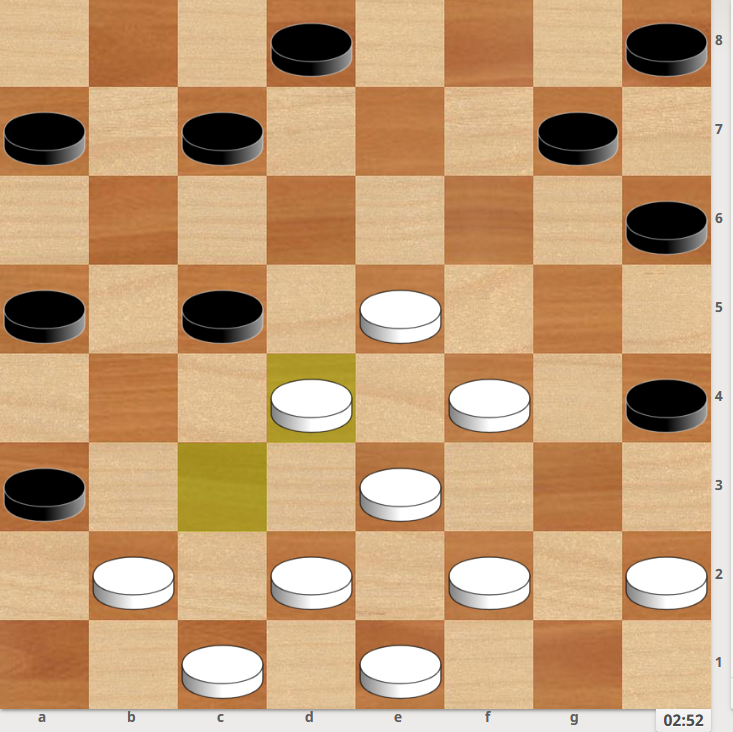 1... h6-g5? (1...cb4! 2.bc3 de7 3.fg3 4.g3 ef6 5.d6 6...b6 7.gf4 e5 8...c7 9.fg5=) 2. d4xb6! (ДРУГОЕ ХУЖЕ - ПРОВЕРЬТЕ) a7xc5 3. f4xb4 a5xa1 4. e5-d6 c7xe5 5. d2-c3 a1xd4 6. e3xc5 h8-g7 7. c5-b6 e5-d4 8. b6-a7 h4-g3 (d4-c3 9.d2x) 9. f2xh4 d4-c3 10. a7-b8 g7-f6 (10...c3 11.b8 cb2 12.e5 a1 13...e7 14.g5x) 11. h4-g5 f6xh4 12. b8-e5 2-0
