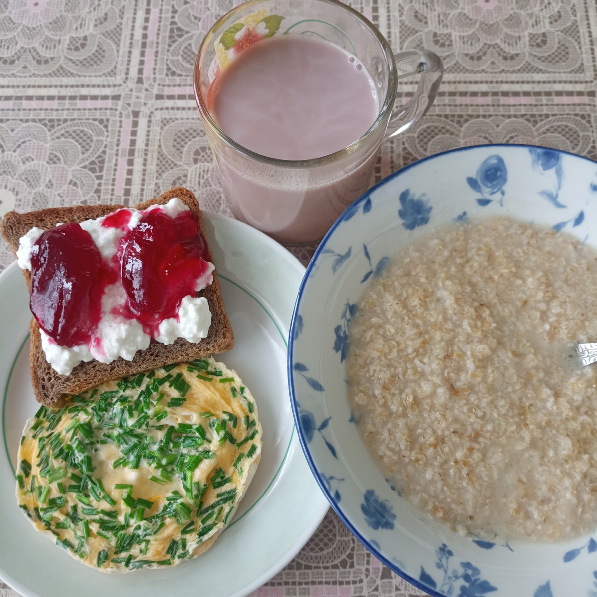 Сегодня вспомнила про яйца, что-то я давненько не готовила омлет. Добавила к омлету зелёный лук с подоконника. Молока хватило только на омлет и немного на какао. Каша на воде. Такая она мне тоже нравится.