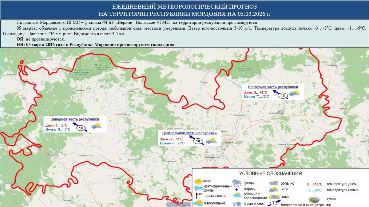 ☁️⛅⛈️ 5 марта в Мордовии облачная с прояснениями погода, небольшой снег, местами умеренный с видимостью в осадках 3-5 км, гололедица