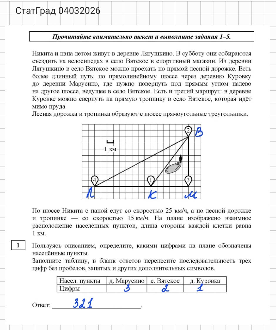В этой статье представляю разбор первой части варианта СтатГрад ОГЭ по математике. Первые пять заданий на тему "План местности". Сначала внимательно читаем задачу и расставляем на плане название деревень. Первое задание готово. Второе задание довольно простое, так как расстояние, которое нужно посчитать, легко считается по клеткам. Далее, третье задание. Здесь уже расстояние считаем по теореме Пифагора. В четвёртом задании обратите внимание, что ответ нужно дать в минутах Задание 5 Спасибо за внимание. Буду рада вашим комментариям, лайкам и подписке на канал, а также если вы поддержите мой канал. Разбор второй части будет выложен на канале в MAX. Подписаться