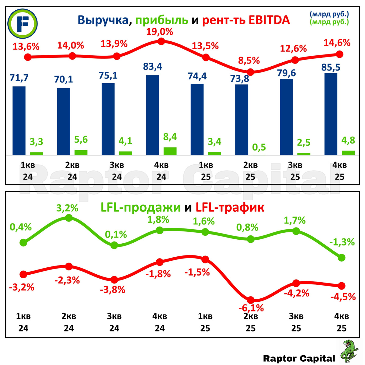 📌 Ритейлер Fix Price вчера опубликовал отчёт за 2025 год и сообщил о планах выплатить высокие дивиденды, на что акции отреагировали ростом на 9% за один день. Делюсь ключевыми моментами из отчёта и своим мнением о привлекательности акций. • Выручка выросла на 4,3% год к году до 313,3 млрд рублей, рост ниже инфляции уже третий год подряд. Чистая прибыль упала почти в 2 раза до 11,2 млрд рублей из-за роста расходов на 24,2% до 61,2 млрд рублей (доля расходов в выручке выросла с 16,4% до 19,5%). • Если смотреть на квартальные показатели (верхний график), то рентабельность год к году падала в каждом из четырёх кварталов, а под конец года снижение прибыли ускорилось. • Главная проблема Фикс Прайса в падающем уже 4-й год подряд LFL-трафике. Без учёта новых магазинов в Фикс Прайс приходит всё меньше людей, в трёх последних кварталах снижение числа покупателей только ускорилось до 4,2-6,1% (нижний график). Вдобавок в 4 квартале снизились и LFL-продажи на 1,3%, причинами назвали усиление конку