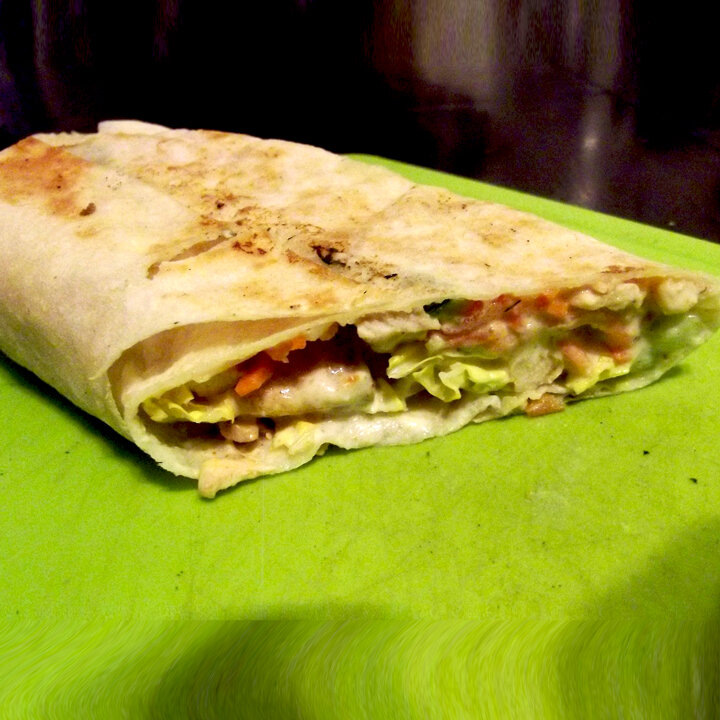 ✔ Филе куриное, вареное) — 300 г; ✔ Капуста пекинская — 200 г; ✔ Помидоры —2 шт.; ✔ Огурец —1 шт.; ✔ Морковь по-корейски — 75 г; ✔ Лук —1 шт.; ✔ Лаваш тонкий (армянский) — 2 листа (≈ 200 г, по 100 г каждый). Для соуса: ✔ Йогурт натуральный (греческий, 2%) — 150 г; ✔ Сметана 15% — 100 г; ✔ Горчица (столовая) —≈1 ч.л. с горкой; ✔ Чеснок —1 крупный зубчик; ✔ Соль, хмели-сунели, красная паприка — по вкусу. Для обжарки лука: ✔ Масло растительное —≈ 1 ч. л. Для соуса смешать все компоненты. Собственно, приготовление соуса - полный вкусовой произвол, можно найти десятки разных рецептов. Поскольку овощи пресные, соус должен быть довольно ярким, с остринкой. Курицу нарезать на небольшие кусочки. Капусту нарезать на полоски, остальные овощи - тонкими полосками. Выложить овощи и курицу полоской, отступив несколько сантиметров от края, свернуть лаваш, смазав и загнув края. Припечь на сухой сковороде. КБЖУ на 100 г – 109/8,9/3,1/10,8 (из них крахмала ≈65%). + 4 фото Рецепт на странице Ребёнок пропа