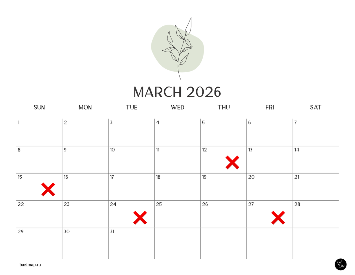 ❗Худшие дни в МАРТЕ месяца Металлического Кролика 辛卯 ⭐ Возможен повышенный уровень эмоций, споры и выяснения отношений. Будьте внимательнее за рулем. ✖Никаких важных дел не планируйте в эти дни. Часы поддержки есть в благоприятном календаре. Либо пользуйтесь Вашими благородными людьми для неотложных дел. Подробности Марта в разделе "Разбор месяца" ________ Что несут Дни "Разрушение" и "Опасность" Значение каждого из дней — читать Bazimap.ru | VK | 2026 | Instagram
