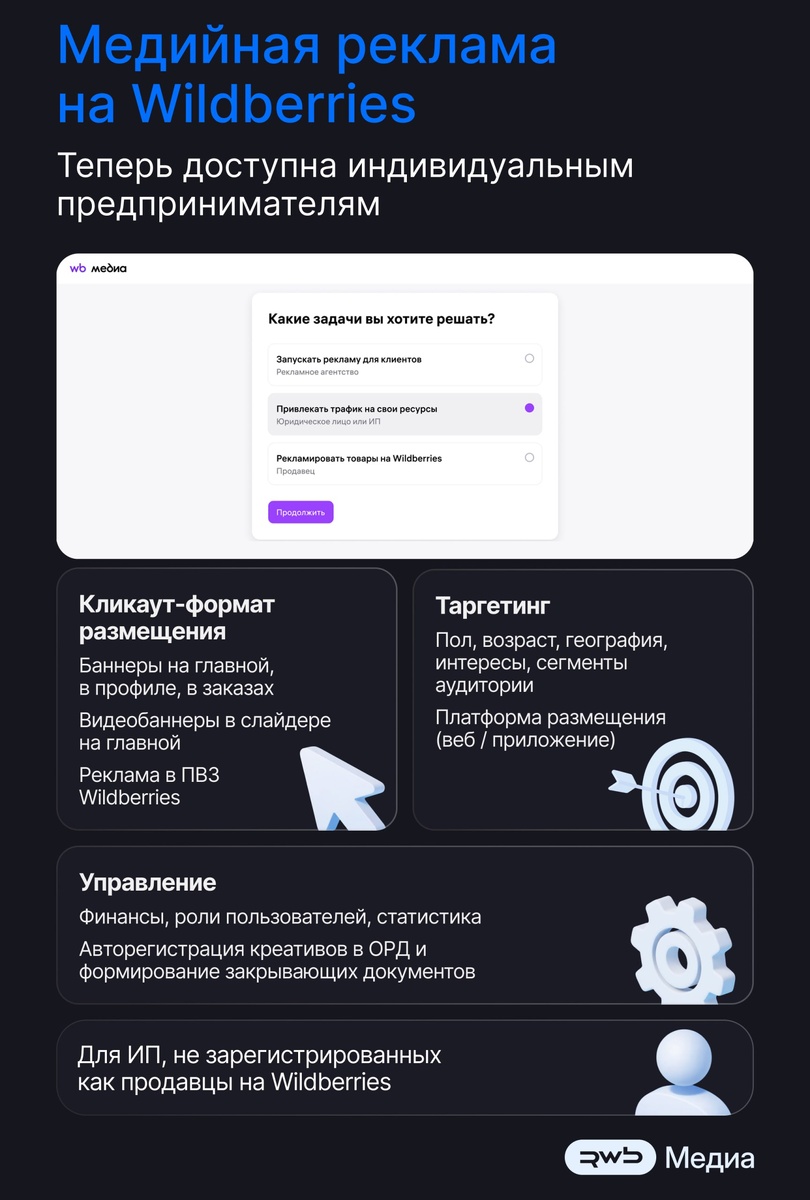 Wildberries открыл доступ к медийной рекламе для внешних рекламодателей-ИП. • Раньше медийная реклама была доступна только продавцам на маркетплейсе • Теперь ИП без статуса продавца могут использовать этот инструмент • Обновление касается кабинета для внешних рекламодателей Источники: - @wbsellerofficial — https://t.me/wbsellerofficial/6120