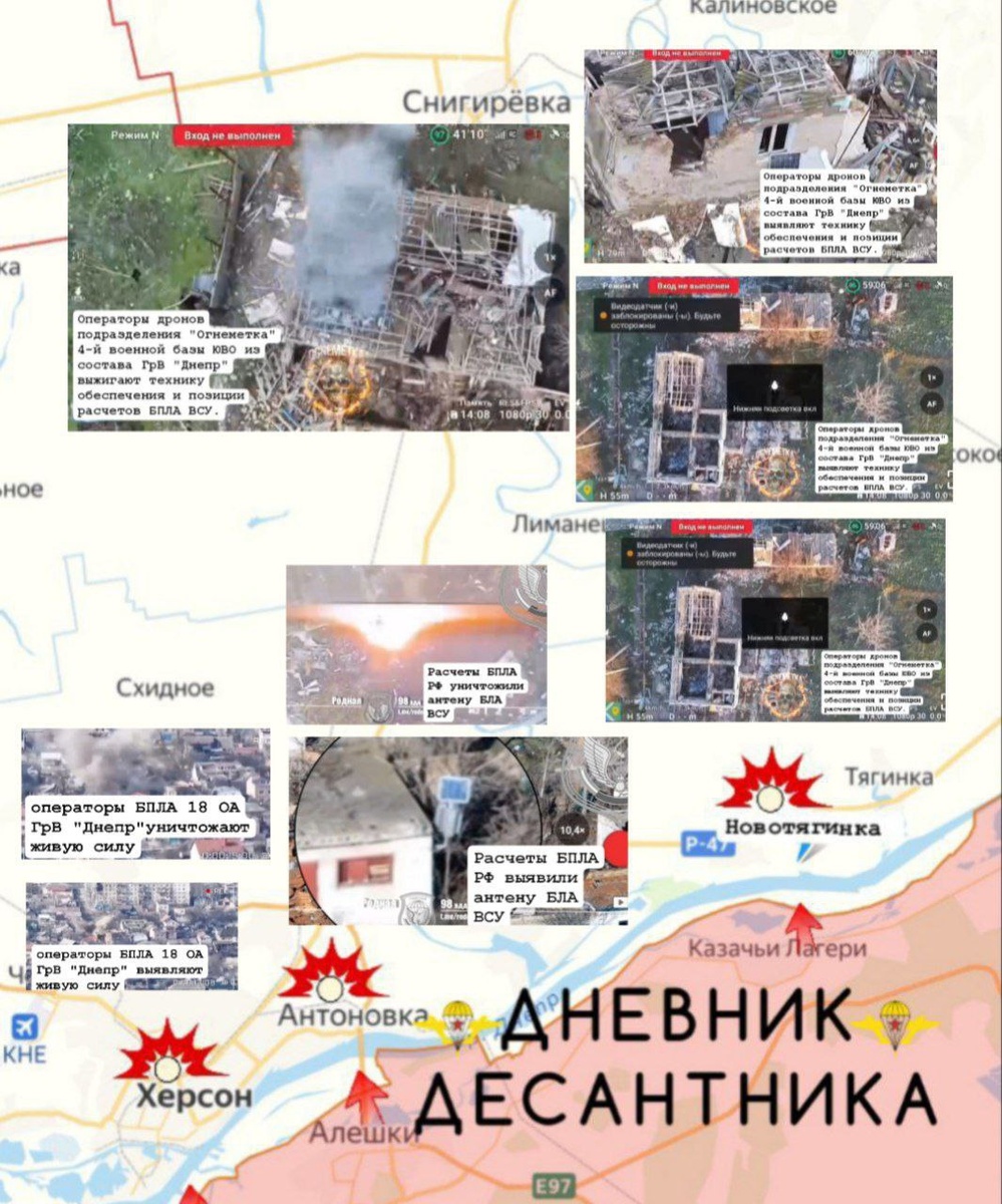 Характер боевых действий остается неизменным. ВС РФ методично уничтожают инфраструктуру врага, нанося точечные удары по антеннам связи и пунктам управления БПЛА ВСУ. Противник отвечает террористическими обстрелами по левобережью Днепра. На Херсонском направлении самая высокая интенсивность взаимного применения дронов. Российские расчёты FPV-дронов работают ежедневно и с высокой точностью, уничтожая пункты управления БПЛА, живую силу и технику ВСУ прямо в городской застройке правобережья . Кроме того, дроны на оптоволокне, против которых не работает радиоэлектронная разведка, уже долетают до крупных городов, и украинская сторона публично признаёт, что эта угроза требует технологического решения, которого пока нет. На левом берегу оператор БПЛА 18 ОА ГрВ "Днепр" уничтожает FPV-дрон - "ждун" боевиков ВСУ. (видео) ▫️ В Херсоне операторы БПЛА 18 ОА ГрВ "Днепр" выявляют и уничтожают живую силу противника. ▫️ В районе населенного пункта Антоновка расчеты наших БПЛА уничтожил. Вражескую ан