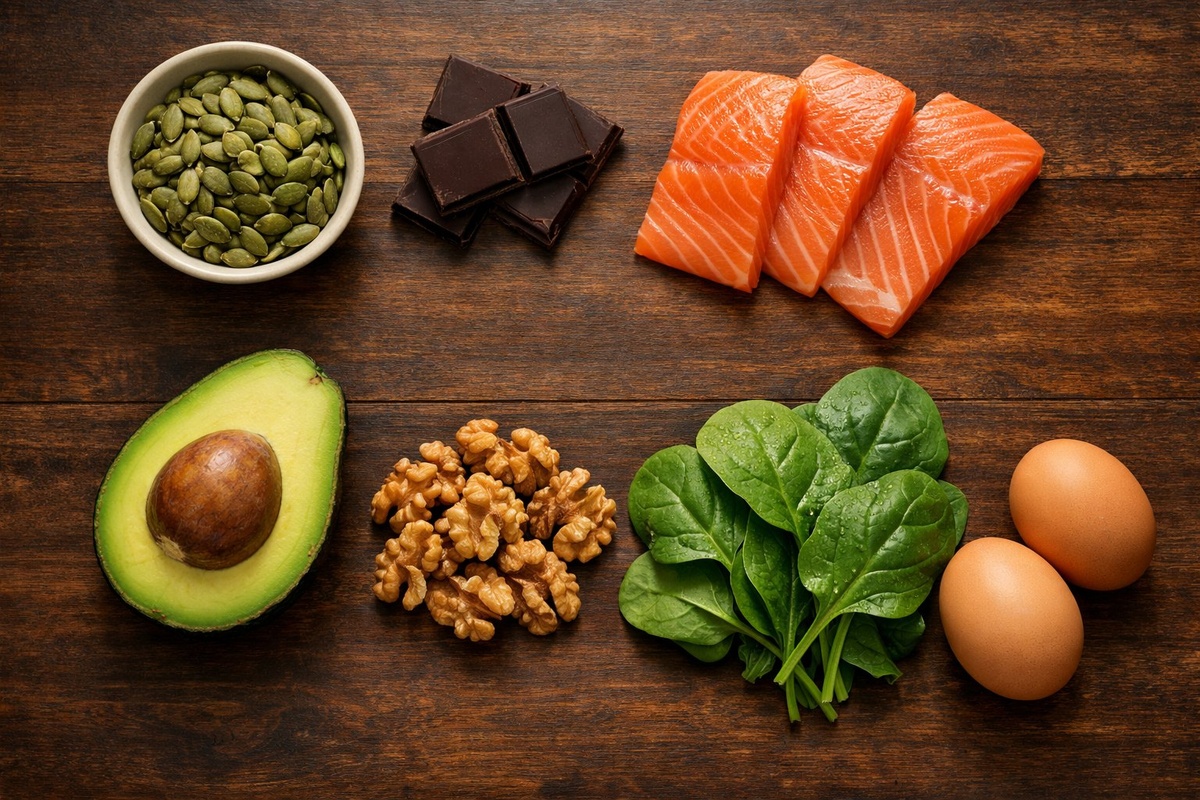 Где искать: тёмный шоколад (от 70% какао – около 65 мг на 30 г), шпинат (78 мг на 100 г), тыквенные семечки (до 150 мг на 30 г), авокадо (58 мг на один плод), бананы (27 мг на штуку) [6].