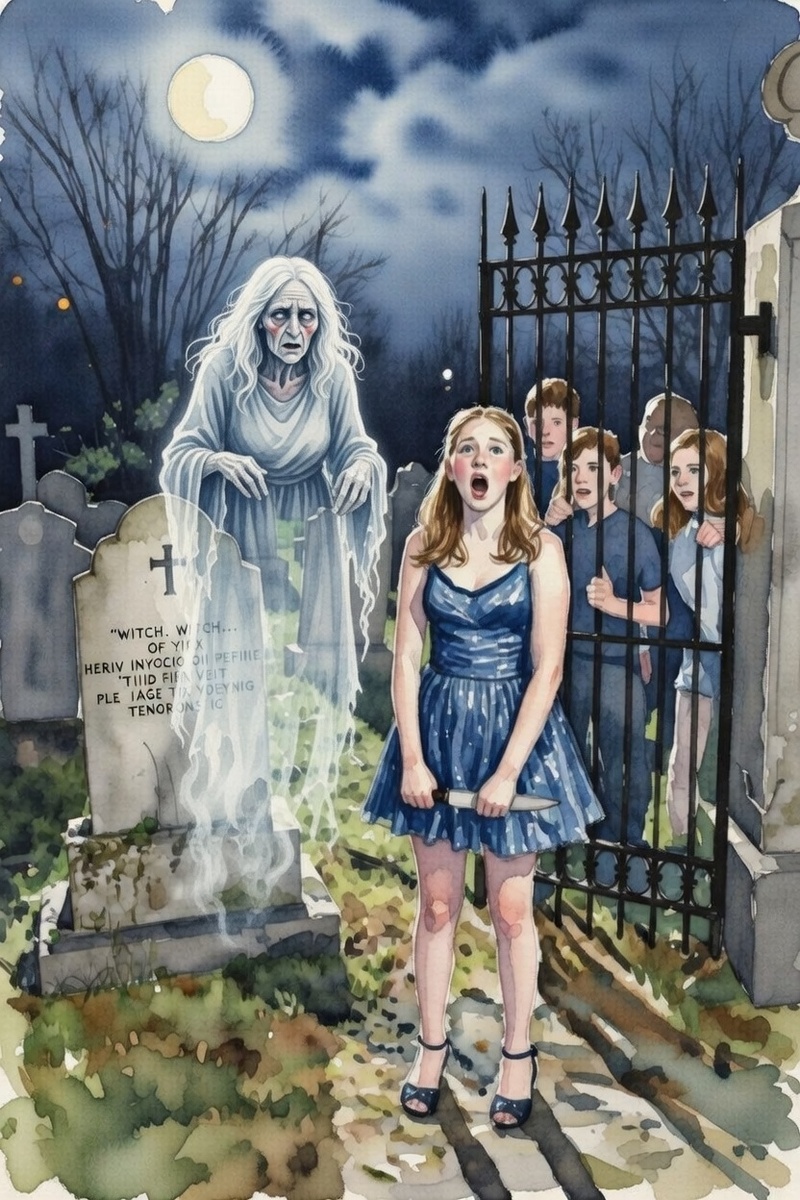 Друзья, охваченные страхом и азартом, быстро согласились. Через несколько минут группа подростков нерешительно собралась у ржавых чугунных ворот кладбища. Ветер шумел в ветвях старых вязов, раскачивая их, как маятники. Лекси, сжимая в потной ладони холодную рукоять ножа, сделала первый шаг вперед. Скрип открывающихся ворот напоминал стон.