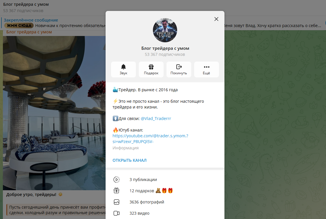 Сегодня поговорим о Телеграмм канале Блог трейдера с умом. Это проект посвященный торговле криптовалютой. Админ говорит, что уже много лет занимается трейдингом и готов этому научить других. Именно по этой причине был создан Телеграмм канал, в котором рассказываются все тонкости торговли и в котором сам же автор приглашает в свой VIP-клуб и бот. Дальше в обзоре мы расскажем более детально о сообществе и объясним можно ли ему доверять. Также расскажем, какие отзывы пишут клиенты о Блог трейдера с умом. ✅ Кстати, проверенный метод заработка здесь◀️ Телеграмм канал Блог трейдера с умом работает уже немало времени. Его ведет трейдер Влад, который в трейдинге уже 9 лет. Он прошел долгий путь, в котором сливал депозиты из-за недостаточного количества знаний и навыков и в результате пришел к хорошему результату и стабильному заработку. На самом канале Блог трейдера с умом нет практических советов по торговле, так как паблик создан более с рекламной целью. Трейдер продвигает свой продукт, приг