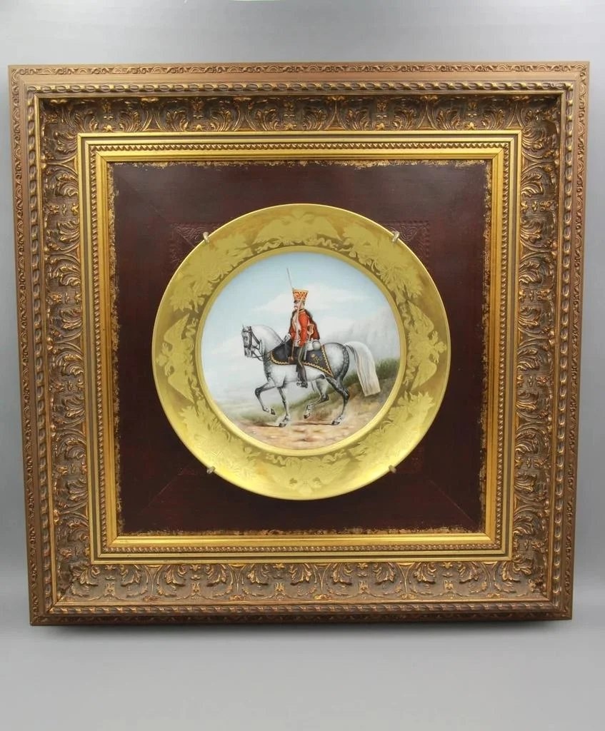 ” Художественная мастерская Лады Быстрицкой, 2006 Фарфоровые тарелки с ручной росписью Ольги Волковой по мотивам картин Зауервейда («Рядовой лейб-гвардии Драгунского полка», «Обер-офицер Лейб-Гвардейского Гусарского полка», 1818–1819) и Франца Крюгера («Портрет Фридриха Вильгельма III верхом на коне») из Военной галереи Зимнего дворца. Материал: фарфор, ручная роспись. Диаметр: 245 и 270 мм. Стоимость за 1 тарелку. Возможна рама. Традиция военного фарфора возникла при Александре I (1810-е) и длилась до 1910-х. Популярна при Николае I и Александре II. Серии различались цветом: «красная», «бирюзовая», «сиреневая», «золотая». Расписывали лучшие мастера: Елашевский, Крюков, Мидин, Миронов, Столетов, Яковлев, Волкова и др. Стоимость лота: 320 000 ₽ Подробнее на нашем сайте