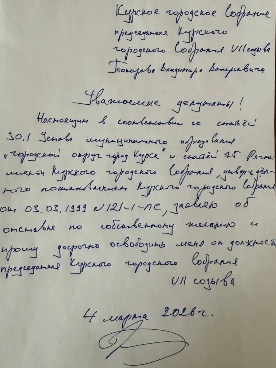 Председатель Курского горсобрания Владимир Токарев попросил об отставке