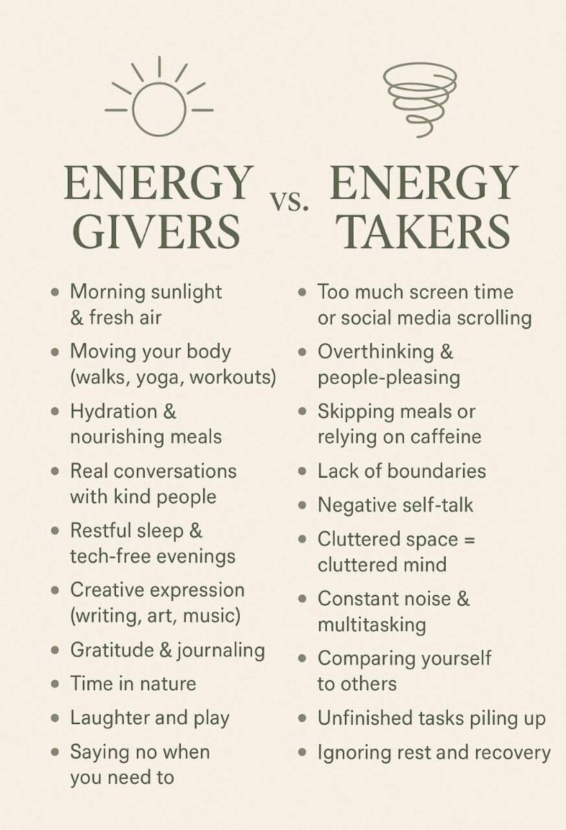 ? Энергия - самая ценная валюта жизни. И вырабатывается она в нас в достаточном количестве. А дефицит энергии формируется в результате того, на что мы ее тратим. Большая часть энергии уходит на ваши индивидуальные вариации этих пунктов: Подавление и сдерживание Не на действие (действия наоборот дают энергию), а на удерживание себя от действия. • сдерживание эмоций; • подавление желаний; • терпение того, что неудобно или неприятно. Для пущей визуализации, можно сказать, что энергия, предназначенная для действия (оттолкнуть, попросить, заявить), разворачивается и бьет по вам же. Вы становитесь и тем, кто бьет, и тем, кого бьют. Пу-пу-пууу. Внутренний монолог Поток беспорядочных и негативных мыслей - бесконечное прокручивание возможных и невозможных сценариев будущего, переживания о прошлом, беспокойство и догадки. Энергия тратится не на проверку своих предположений (опять же, действия, которые дают энергию), а на поддержание целого мира догадок, домыслов и страхов. Если замечаете, ч