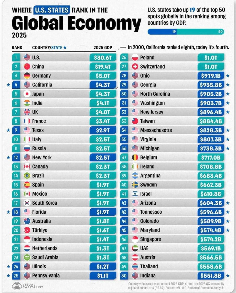 По данным Visual Capitalist крупнейшие экономики мира продолжают концентрировать основную часть глобального ВВП. США, Китай, Германия, Япония и Индия формируют ядро мировой экономической системы. Россия находится во второй десятке глобального рейтинга. Разрыв между первой пятёркой и остальными странами остаётся существенным. При этом структура роста меняется. Азия усиливает позиции, развивающиеся рынки наращивают вклад, а традиционные европейские экономики сталкиваются с более умеренными темпами расширения. Экономический вес всё чаще перераспределяется в пользу стран с масштабным внутренним рынком, технологическим сектором и экспортной устойчивостью. Для бизнеса это не абстрактные рейтинги. Размер экономики напрямую связан с ёмкостью рынка, инвестиционной привлекательностью, скоростью масштабирования и уровнем конкуренции. —————————————- 🌸Именно такую оптику даёт эксклюзивная бизнес-папка, в которой собрались топовые каналы с аналитикой, стратегиями, историями предпринимателей, раз