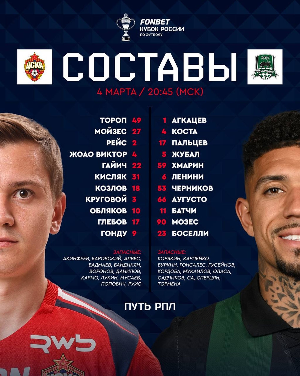 Одного взгляда на стартовые составы команд перед этой игрой достаточно, чтобы понять те задачи, которые клубы будут решать в этом матче. ЦСКА выставил практически полностью боевой состав, за исключением дисквалифицированного еще за прошлогодние подвиги в составе «Локомотива» Баринова. Это говорит о том, что армейцы собираются максимально решить вопрос уже в первом матче. Состав «Краснодара» без Сперцяна и Кордобы говорил о несколько ином раскладе для Краснодара. Мусаев не видит смысла на тяжелом московском поле играть в атаку. Поэтому выставил немного экспериментальный состав с явной надеждой не проиграть в Москве, а вопрос выхода в следующую стадию решать уже в домашнем матче на нормальном газоне и при привычном лояльном для себя судействе.