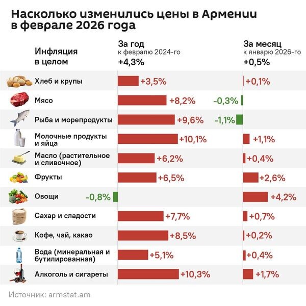 Годовая инфляция в Армении в феврале 2026 года составила 4,3%. Об этом свидетельствуют данные Статкомитета республики.