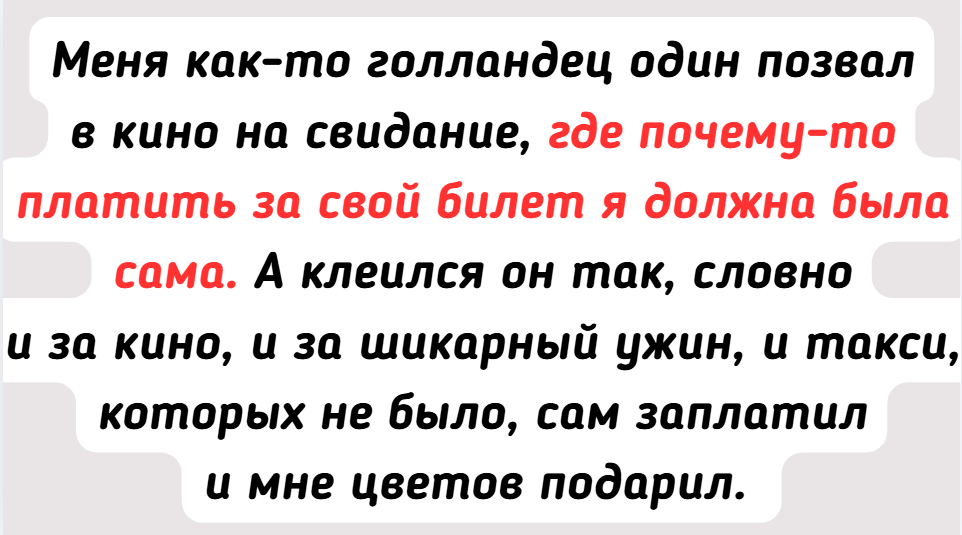 - Меня как-то голландец один позвал в кино на свидание, где почему-то платить за свой билет я должна была сама. А клеился он так, словно и за кино, и за шикарный ужин, и такси, которых не было, сам заплатил и мне цветов подарил. Что и говорить, второй раз видеть его не хотелось. © Dora T / ADME