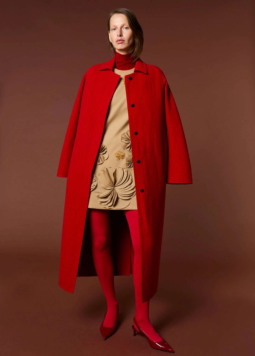 Иногда самые интересные коллекции — не те, где всё кричит о трендах, а те, где мода говорит спокойно и уверенно. Именно такой получилась коллекция by FANG Осень–Зима 2026/2027, представленная на Парижской неделе моды. Главная идея коллекции — простая элегантность, которую можно носить в реальной жизни. Дизайнер делает ставку на чистые линии, мягкие силуэты и комфортные формы. В коллекции много широких брюк, струящихся платьев и лаконичных пальто, которые выглядят современно и легко комбинируются между собой. Особое внимание привлекают детали. На некоторых платьях и топах появляются объёмные тканевые цветы — аккуратные, почти скульптурные. Они добавляют образам женственности и делают вещи запоминающимися. Цветовая палитра тоже очень продуманная. В коллекции преобладают спокойные оттенки — бежевый, молочный, голубой и чёрный. Но иногда появляется яркий акцент, например насыщенный красный образ, который сразу притягивает взгляд. Интересно, что дизайнер сочетает разные настроения: лёгкие в