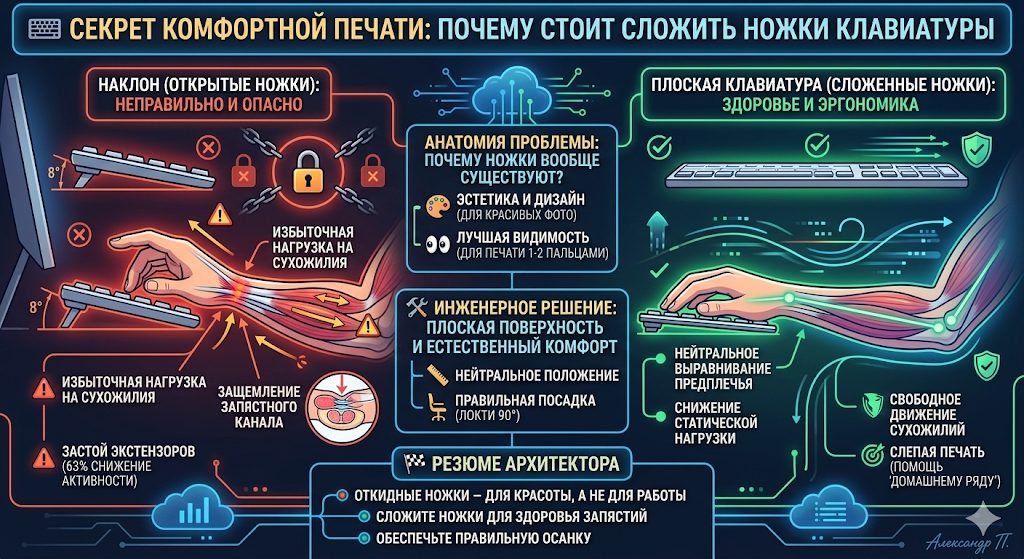Многие из нас проводят за компьютером большую часть дня, и если вы используете внешнюю десктопную клавиатуру, скорее всего, у нее откинуты специальные пластиковые подставки на задней панели. На первый взгляд кажется, что небольшой наклон делает набор текста удобнее, но с инженерной и анатомической точек зрения это ошибка, ведущая к лишнему напряжению и болям. Откидные ножки обычно поднимают заднюю часть клавиатуры на угол от 5° до 12°. Например, популярная модель Logitech MX Mechanical в открытом состоянии дает наклон ровно в 8°. Когда клавиатура наклонена вверх, это вынуждает ваши запястья переходить в состояние неестественного разгибания (экстензии). Подобный угол защемляет запястный канал и создает постоянную избыточную нагрузку на сухожилия. Со временем это мышечное напряжение накапливается, что может привести к сильным болям и даже спровоцировать туннельный синдром.