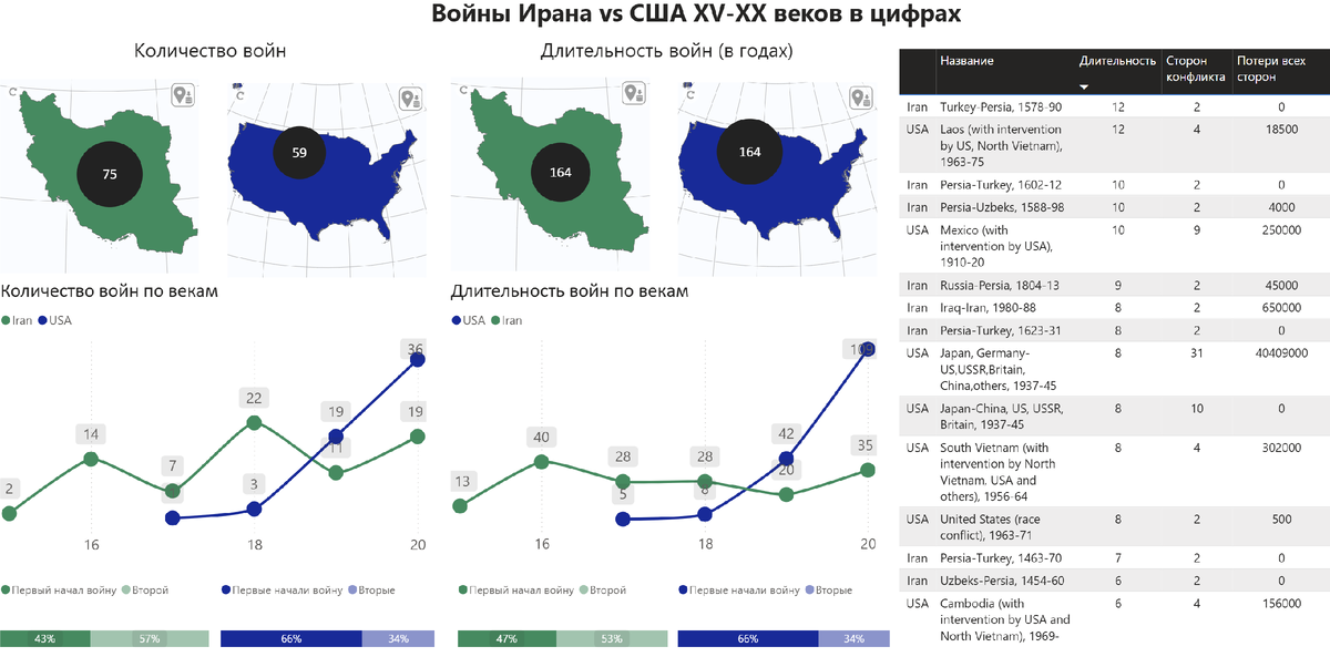 В 43% случаев начинал первым, при этом наступательные войны в среднем длились дольше, чем те, где на Иран нападали.