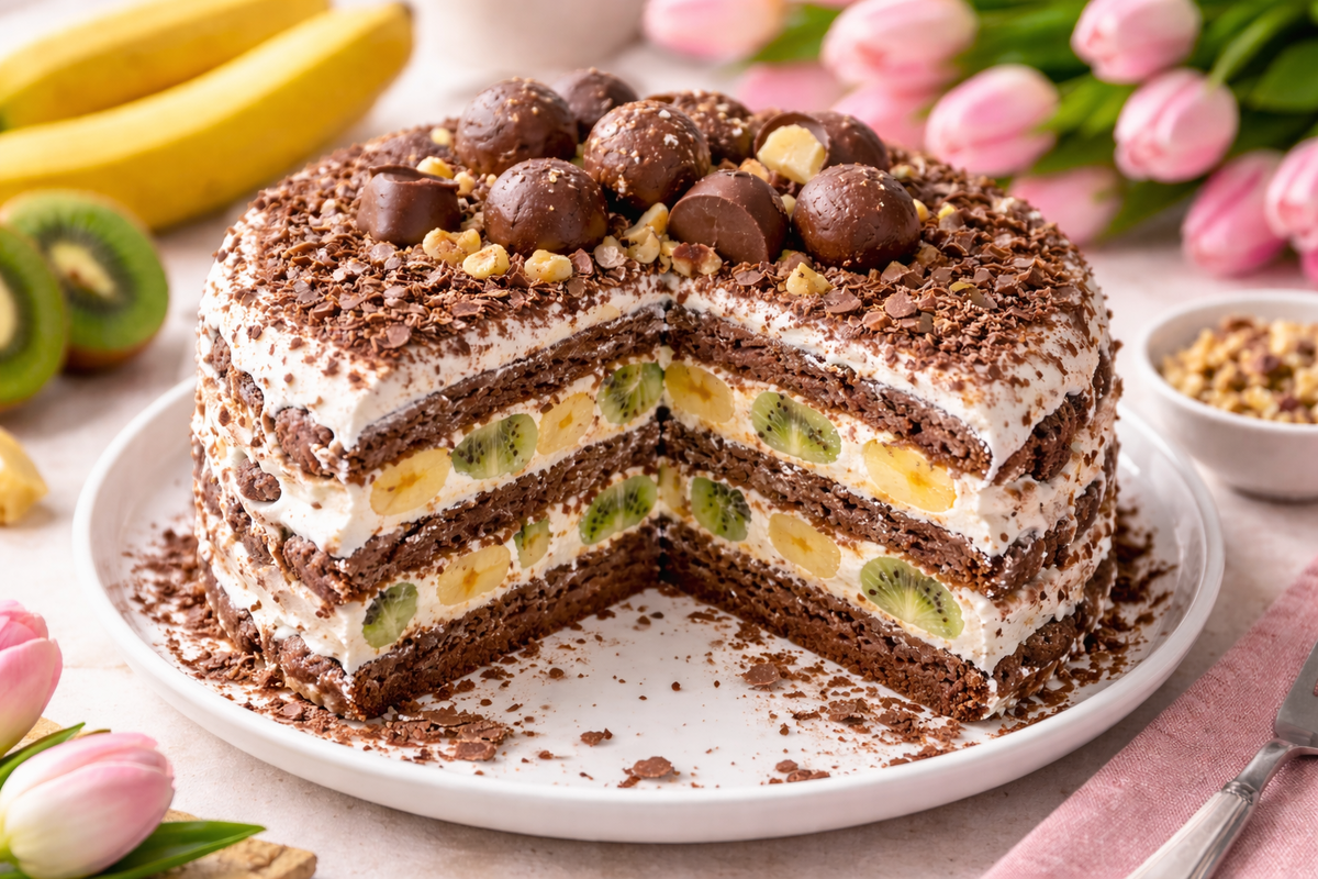 4️⃣ Сверху выкладываем дольки банана и киви. Дальше делаем всё то же самое: пряники → сметана → орехи → бананы и киви. И так собираем весь торт слой за слоем. Он получается высокий, мягкий и очень аппетитный. Когда торт собран, сверху хорошо об
