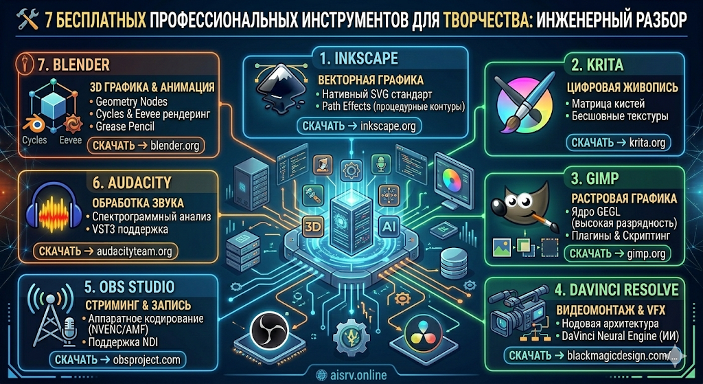 Ошибочно думать, что бесплатное — значит примитивное. Инструменты, о которых пойдет речь ниже, используются в голливудском пост-продакшене, геймдеве и профессиональном дизайне. Я изучил их архитектуру, проанализировал обновления последних лет и подготовил для вас расширенный технический обзор с прямыми ссылками на загрузку.