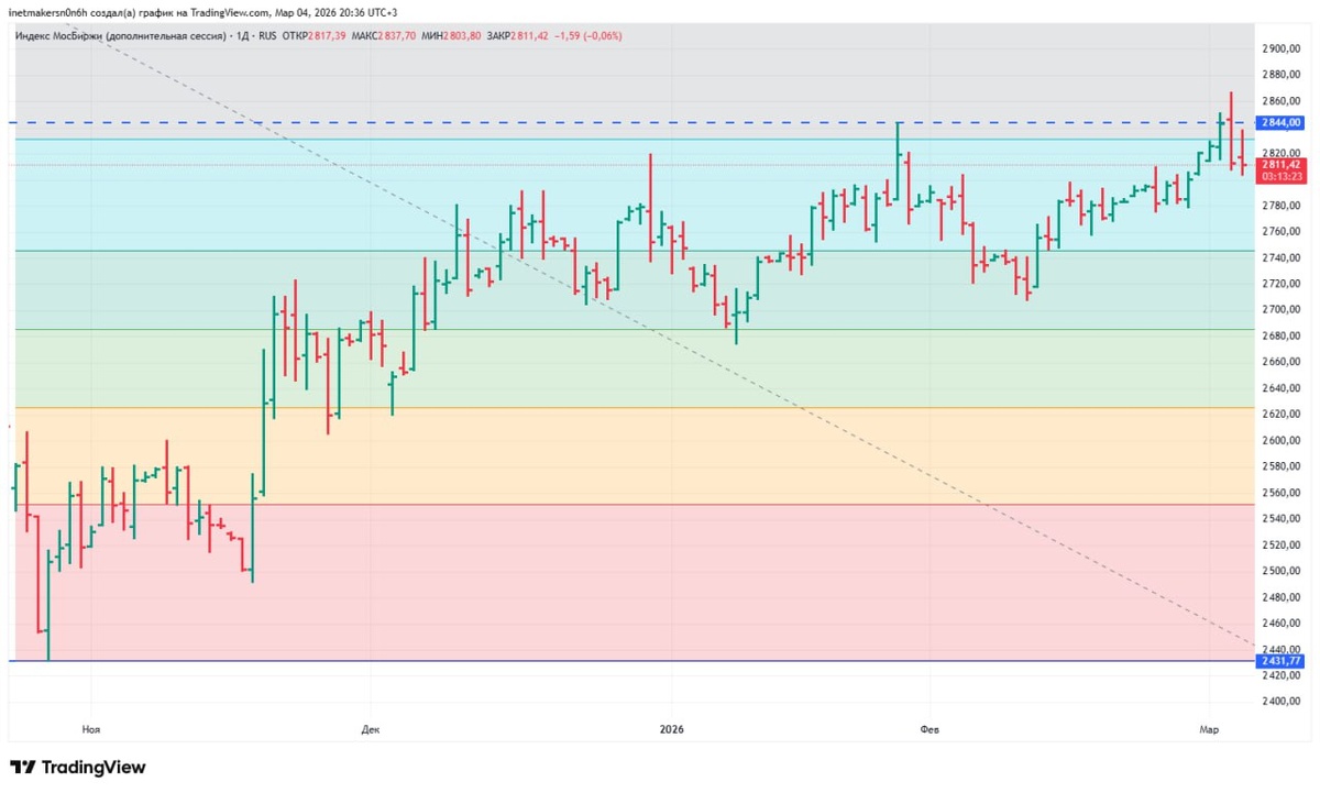 ❗️4 марта российский фондовый рынок снизился, индекс МосБиржи подешевел на 0,54% до уровня 2809,78