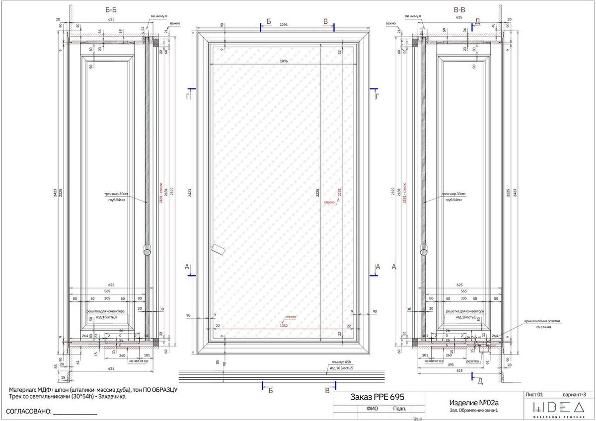 Но именно окна — это концентрат всей сложности. Трек проходит в верхнем узле и должен совпасть с потолочной геометрией. Ниже решетка конвектора: рейка с шаг в 10 мм. Шаг не декоративный, он влияет на вентиляцию, ритм и масштаб филенки одновременно. Съемная крышка лючка розетки (отдельный узел). С зазорами, вырезом для открывания, глубиной посадки, потому что розетка интегрирована в основание подоконника. 📍Материал: МДФ со шпоном, штапики массив дуба. Хотим отметить, что абсолютно каждое окно собирается отдельно, потому что одинаковых проемов в природе не существует. В данном случае чертеж определяет и то, как изделие будет выглядеть через 5–10 лет эксплуатации. И в этом проекте таких окон не одно. Назовем этот объект показательно сложным 😉