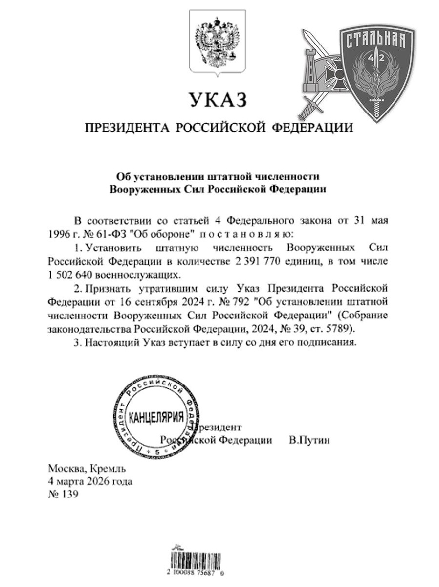 Штатная численность Вооруженных Сил России установлена на уровне 2,4 млн, из которых 1,5 млн — военнослужащие — следует из указа президента