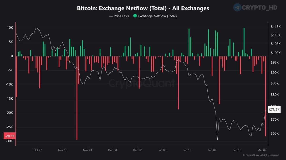 🐃 CryptoQuant: 4 марта с централизованных криптобирж вывели 28,195 BTC ($2b) – чистый отток.