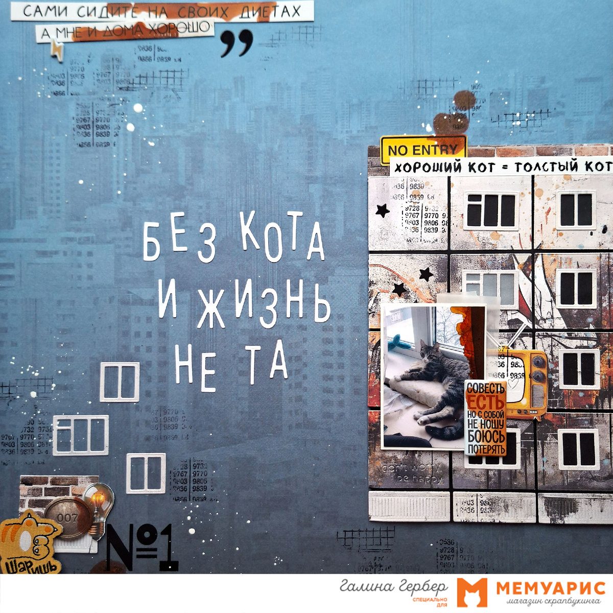 Привет-привет! В эфире Галя Гербер со своей кото-страничкой. Вы конечно же узнали панельку из обзора. Решила всё же пристроить её, что добру пропадать! Лампочку из окошка я убрала, не подходила она мне здесь по концепции, а вот этаж совпал (мы как раз живём на третьем этаже, не помню было ли это спланировано специально при обзоре или нет). Очень в тему пришёлся фотоснимок котика, отдыхающего на своём насиженном местечке на подоконнике. С высоты третьего этажа ежедневно он наблюдает за происходящим на улице. Вот такая история, рассказать которую мне помогли наборы ножей: «Вот и окна в сумраке зажглись», "Коктейль на пляже", "Шрифтомания".