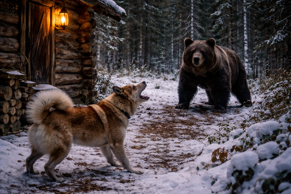 Вы когда-нибудь просыпались в тайге от того, что ваша собака вдруг начинает лаять так, как она лает только на одного зверя? Не на лису, не на белку. А коротко, резко, с рыком в голосе. Старые охотники говорят: если лайка так лает — рядом медведь. Моя избушка стояла на краю старой гаревой делянки. Когда-то там прошёл лесной пожар, и теперь на этом месте рос молодой березняк. Через него проходила тропа к реке, где я ловил хариуса и ставил сети. Со мной жила лайка по кличке Руна. Небольшая, рыжеватая, но очень злая на зверя. За два сезона она уже несколько раз поднимала лося и куницу, но медведя до того дня мы ещё не встречали. Утро тогда было тихое. Я только проснулся, печь ещё тлела, чайник начинал шуметь на плите. Руна лежала у двери, как обычно. И вдруг она резко вскочила. Уши вперёд. Шерсть на холке поднялась. Через секунду она рванула к двери и начала лаять. Не просто лаять — рвать голос. Я сразу понял: зверь. Я схватил куртку и вышел на крыльцо. Руна уже носилась по краю поляны и