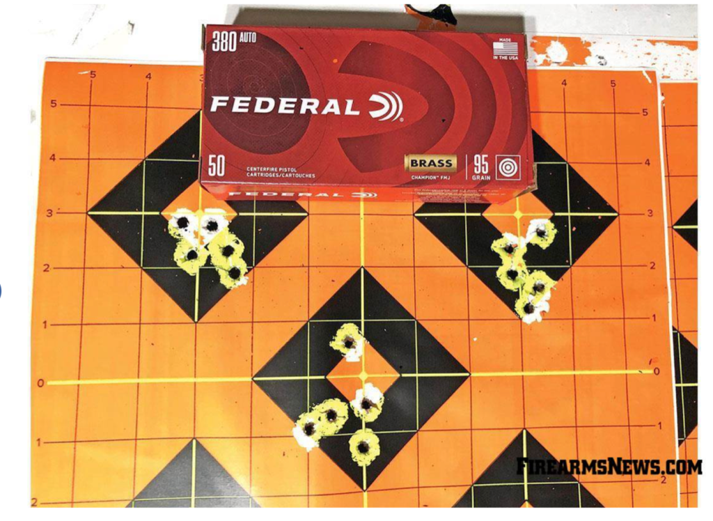 Я установил свой стрелковый упор с мишенями на расстоянии до 25 футов (7,6м). Для проверки точности я сменил патроны на Federal с пулями 95 грейн с цельнометаллической оболочкой и с плоским наконечником калибра .380. Температура воздуха составляла 70 градусов по Фаренгейту (21° С), ветер был от 0 до 4 миль в час (0–1,8 м/с). Тест состоял из трех групп по пять выстрелов, произведенных с упора из мешка с песком.