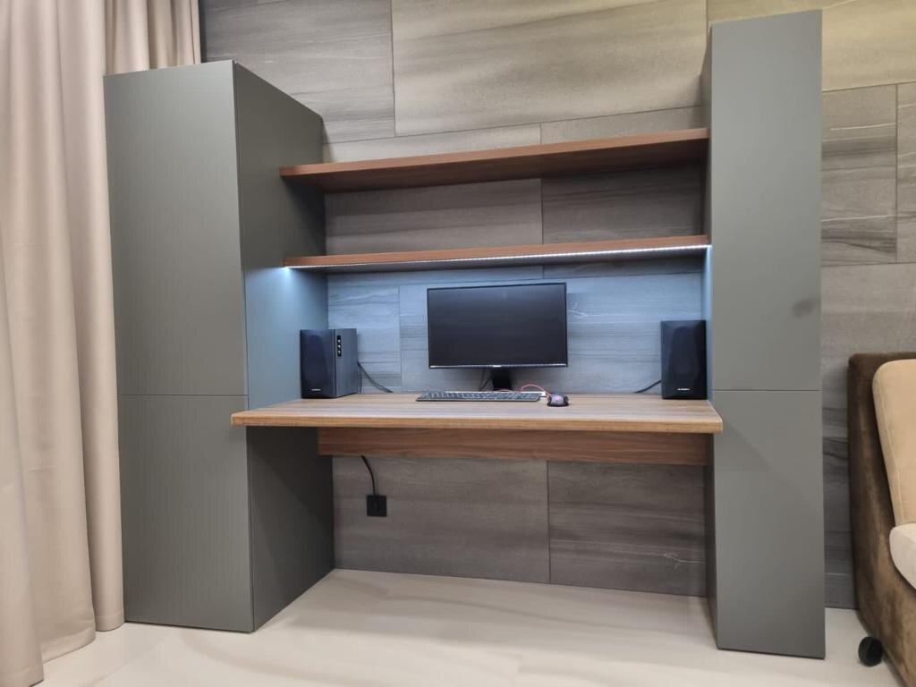 ! Наш рабочий стол — это сочетание функциональности и стиля: ✅ Удобный выкатной принтер всегда под рукой, чтобы быстро распечатать необходимые документы ✅ Фасады из пластика AGT — прочные и стильные ✅ Столешница и полки выполнены из качественного материала кухонной столешницы — надёжно и практично Такое рабочее место вдохновляет и делает любой день продуктивнее ☝️