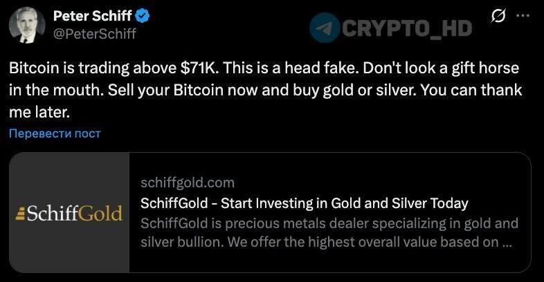 👌 Питер Шифф: Биткоин торгуется выше $71,000. Не смотрите дареному коню в зубы. Продавайте свои BTC сейчас и покупайте Золото или Серебро. Потом скажете мне спасибо.