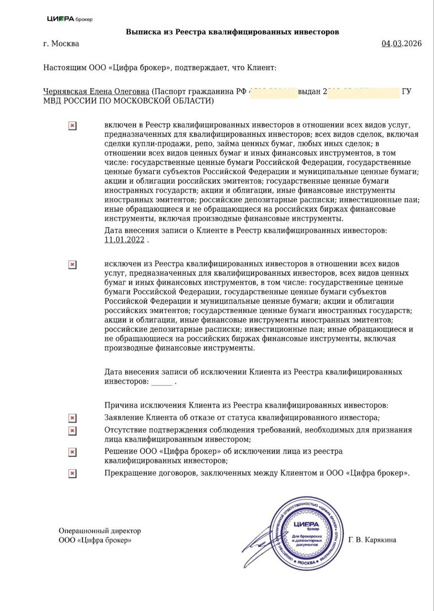 Нужно подтвердить свой экспертный опыт. У меня есть: · опыт работы в банке; · опыт работы финансовым консультантом в статусе самозанятого; · и еще один важный для меня документ — выписка из реестра квалифицированных инвесторов. Этот документ мне особенно дорог. Я получила статус квалифицированного инвестора в 2022 году. Давался он мне непросто: на протяжении года и трёх месяцев я торговала по будильнику пять раз в день. Всё это время со мной были двое маленьких детей, младшая только родилась. Хорошо помню, как кормлю дочь и одновременно всматриваюсь в свечи, ищу точку входа. Тогда я очень много поняла про трейдинг и про себя. Торговала много и агрессивно! В итоге наторговала оборот больше 12 миллионов рублей. Брокер сам вышел на меня и предложил оформить статус квалифицированного инвестора. Ps боюсь, что не сдам этот экзамен 🥹