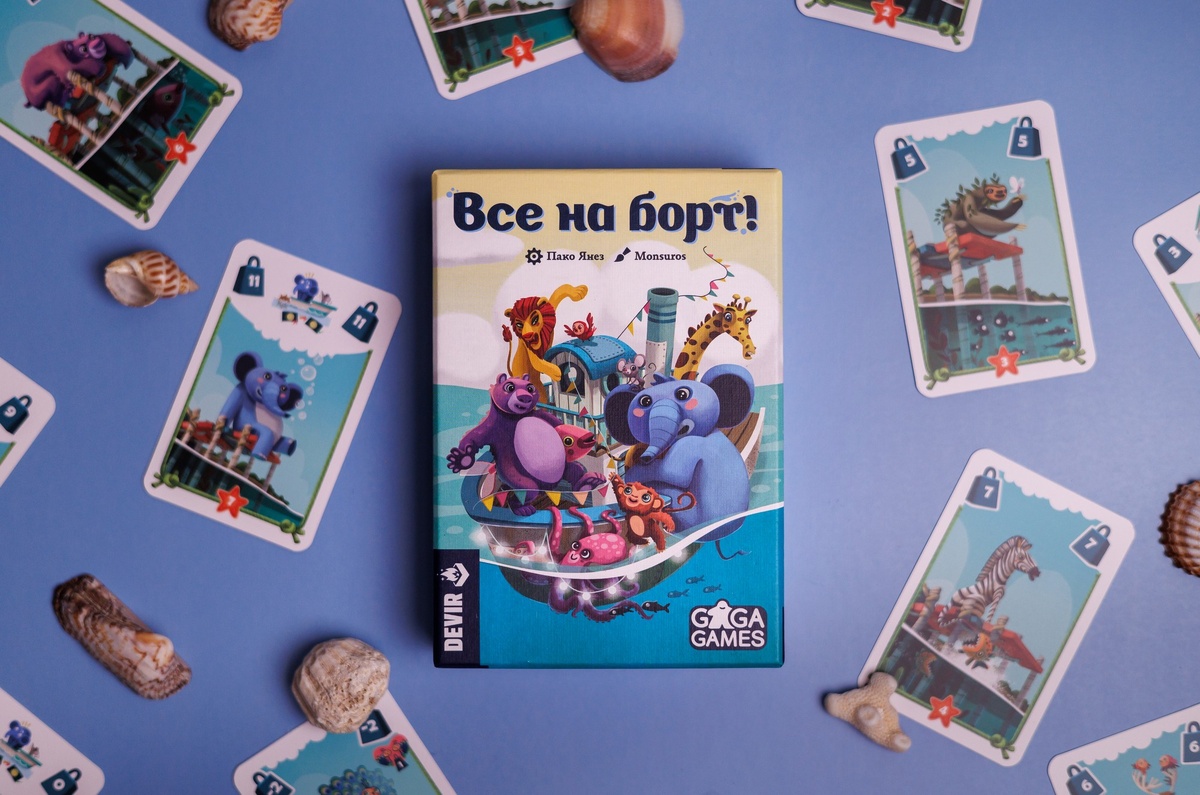 Все на борт! — небольшой филлер, который зацепил меня забавным концептом. У нас есть лодки с определённой грузоподъёмностью, и мы будем выступать в роли эдаких Моисеев и пытаться перевезти как можно больше своих животных. Начало хорошее, а вот что получилось у авторов, расскажу ниже. Как я уже написал — мы возим животных. У каждого игрока по 12 особей и рука из трёх карт. По очереди распихиваем животных на лодки. У лодок есть грузоподъемность, и если её превысить — судно потонет. Лодок ровно по числу игроков и на каждую может попасть по 3 особи. Причём второе животное всегда кладётся взакрытую. Это создаёт основную искру в игре. Какие на самом деле были намерения у игрока — всегда загадка. Для веселения процесса есть ещё 2 небольшие механики. Некоторые животные имеют способности, которые могут существенно повлиять на ситуацию на судне. Например, Обезьяна договаривается самым тяжёлым пассажиром и вместе они выталкивают с лодки третьего на следующую за ними лодку, если таковая вообще име